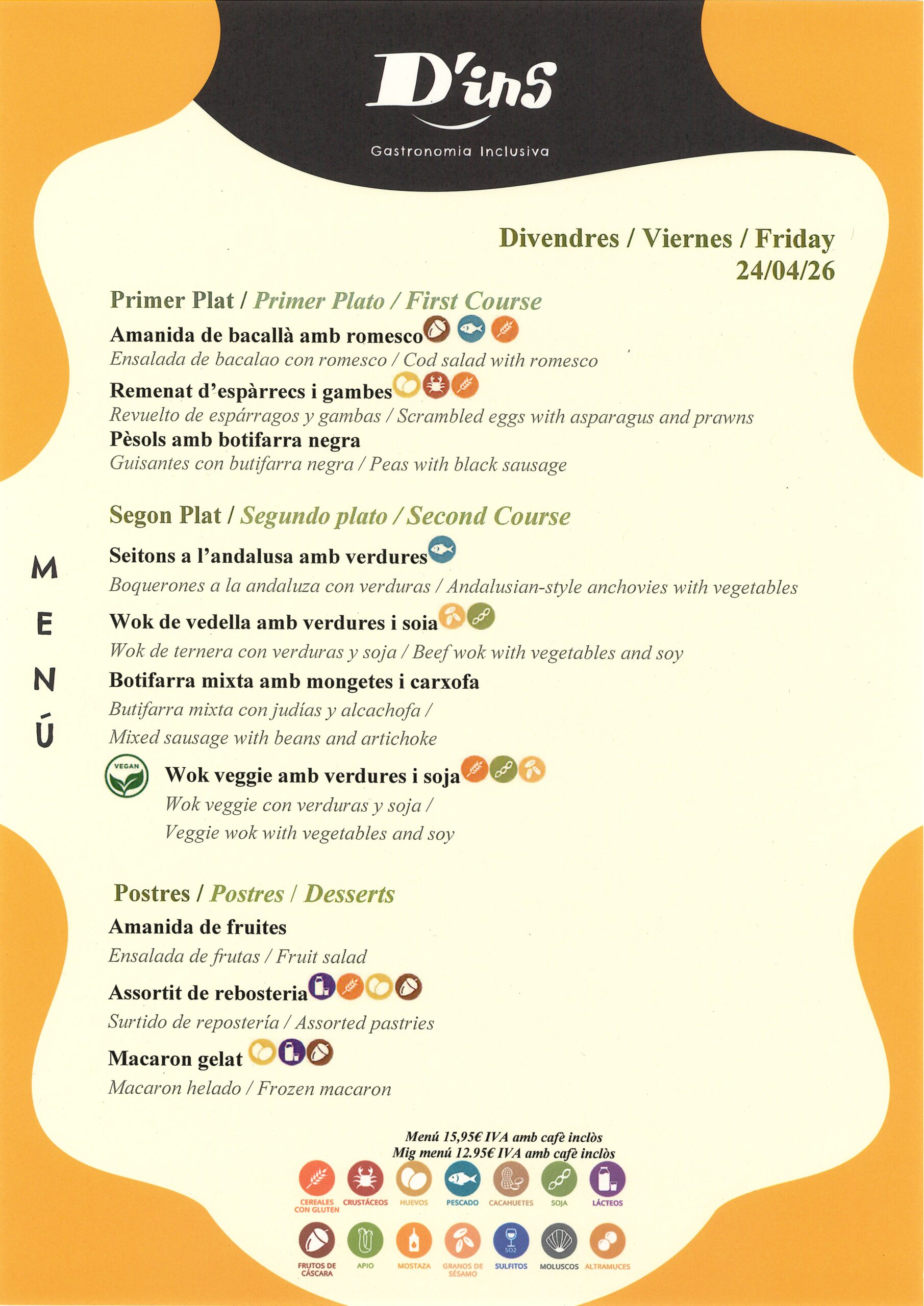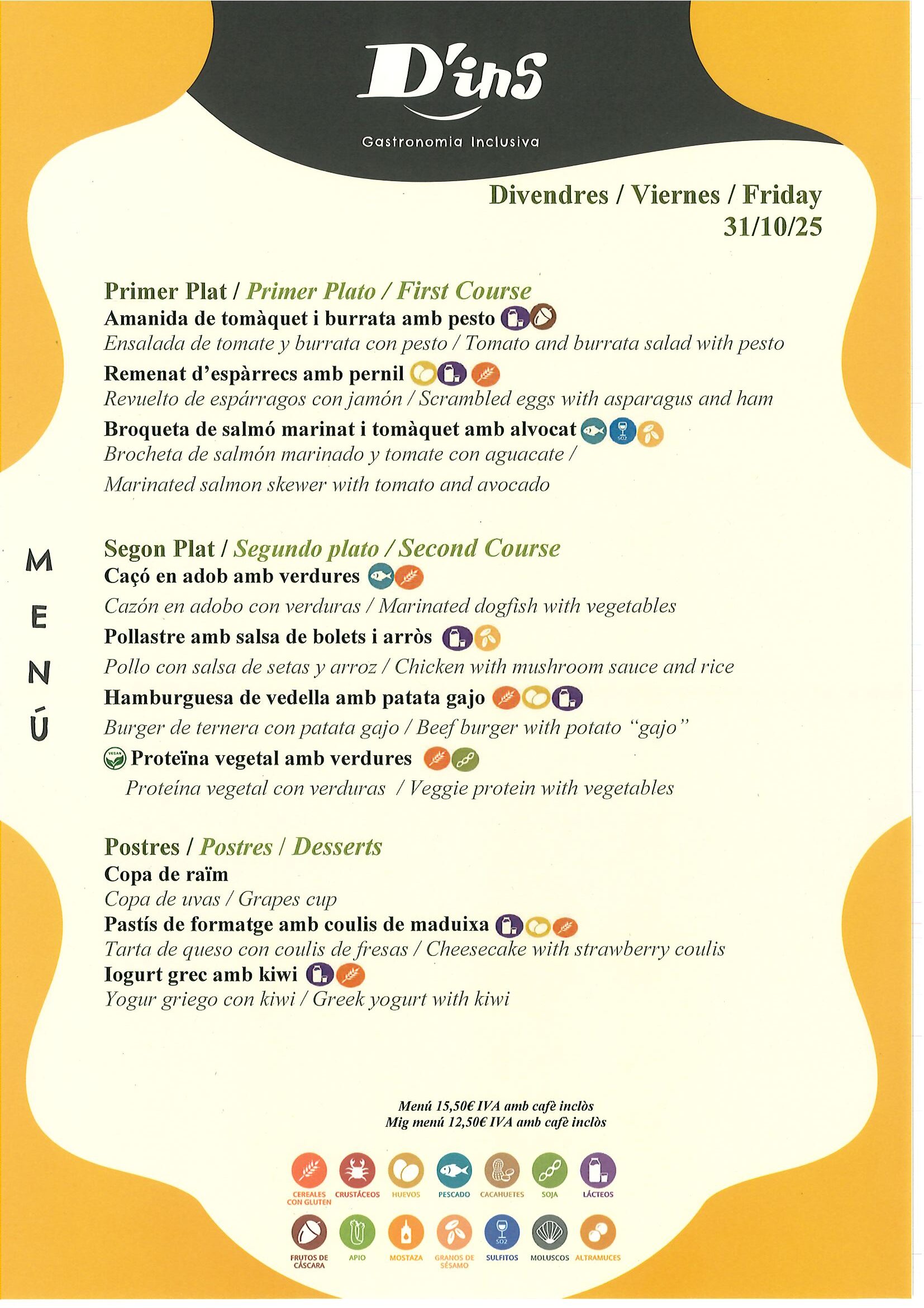Daily Menu: 15,50€ (IVA included). Includes appetizer, main dish, dessert and one drink .
