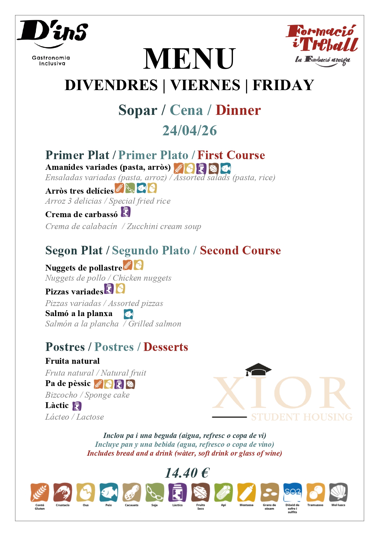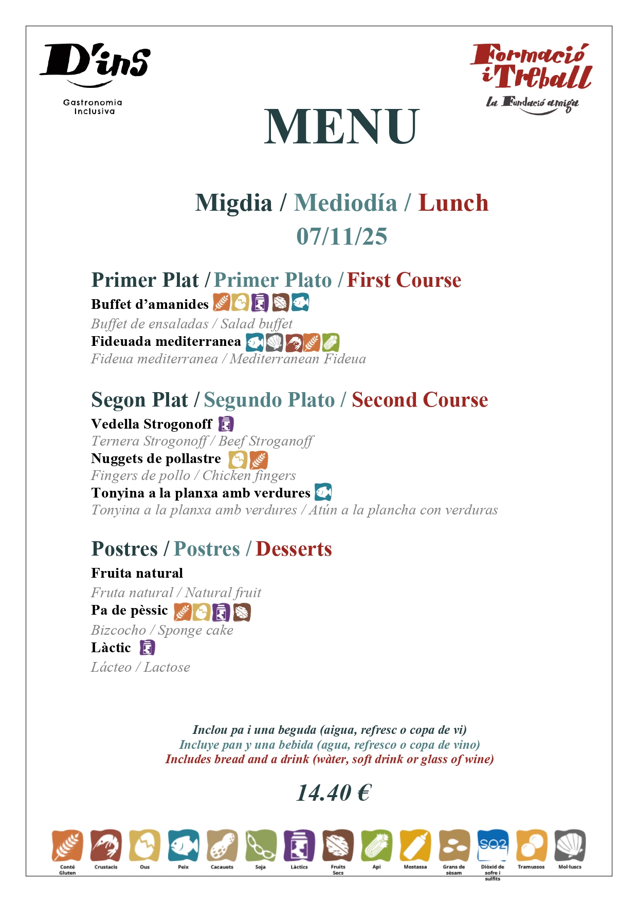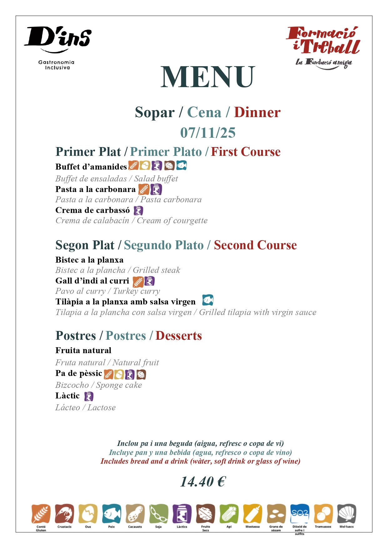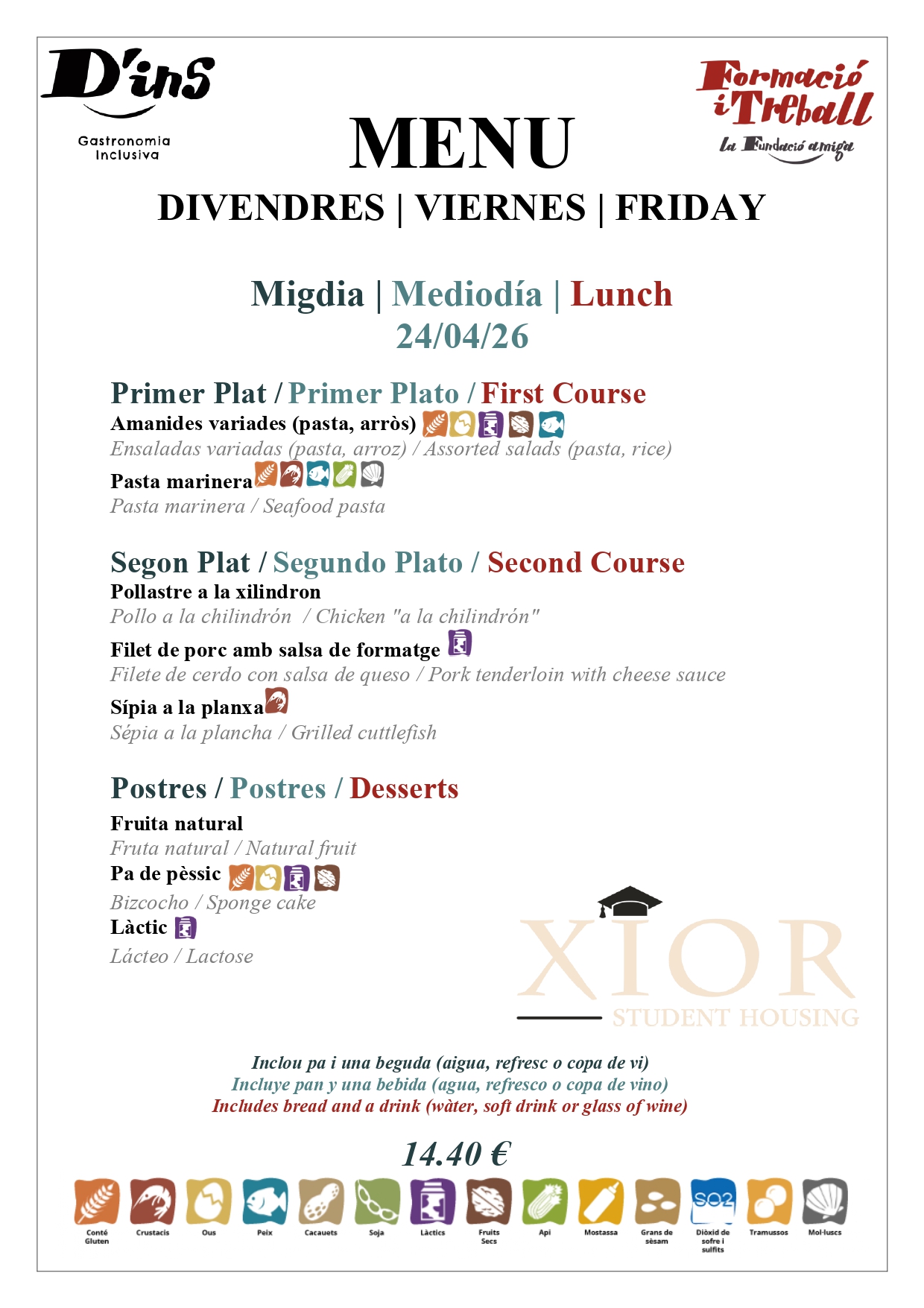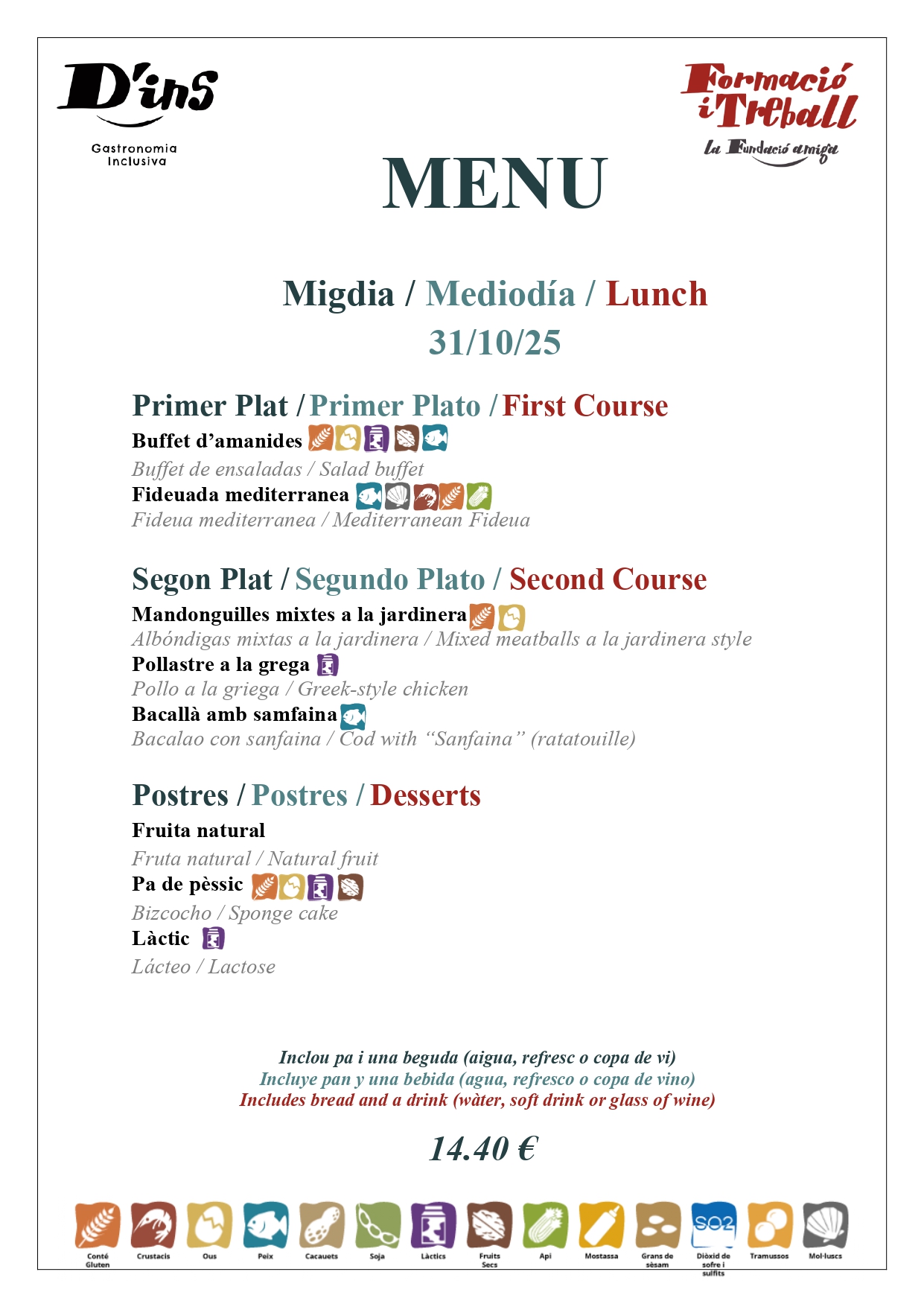 The menu includes bread and a drink (water, soft drink or glass of wine) 13.00 € (IVA included)
