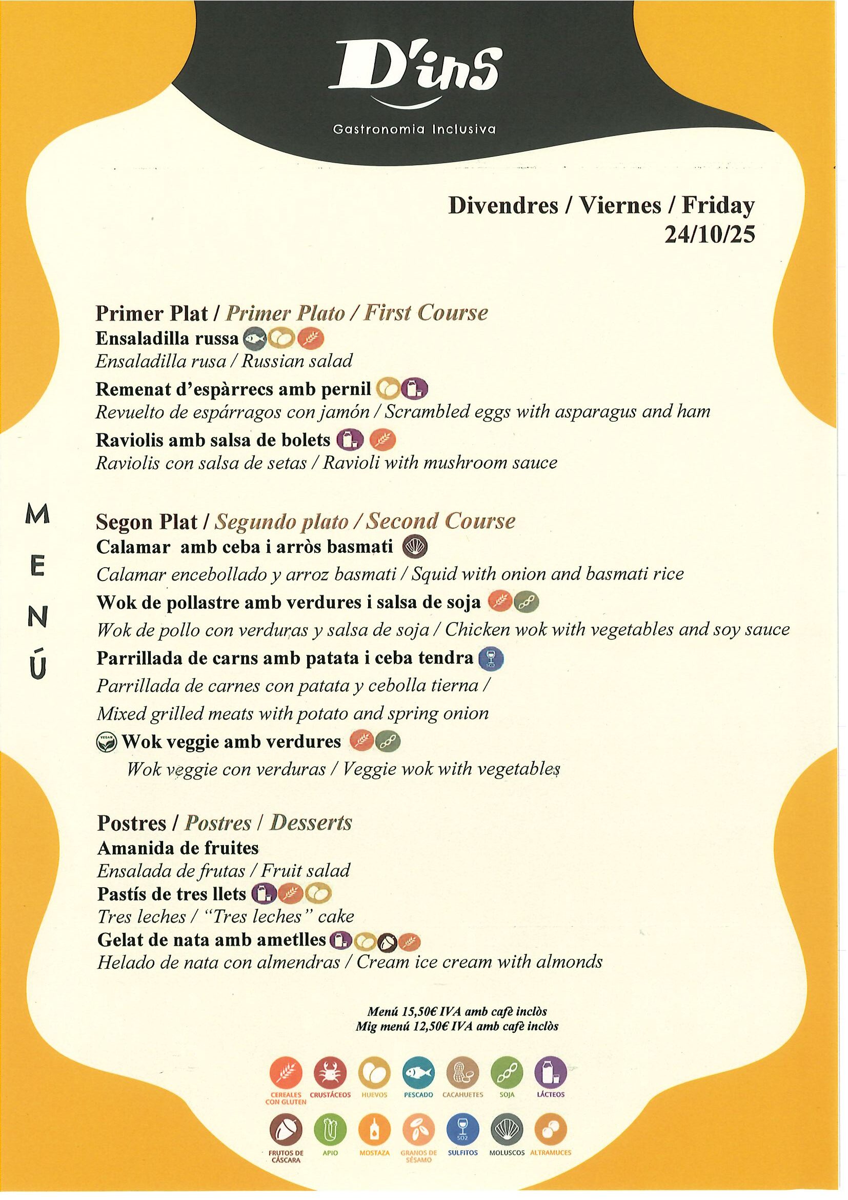 Menú Diari (que inclou primer, segon, postre i una beguda) – 15,50 € IVA inclòs