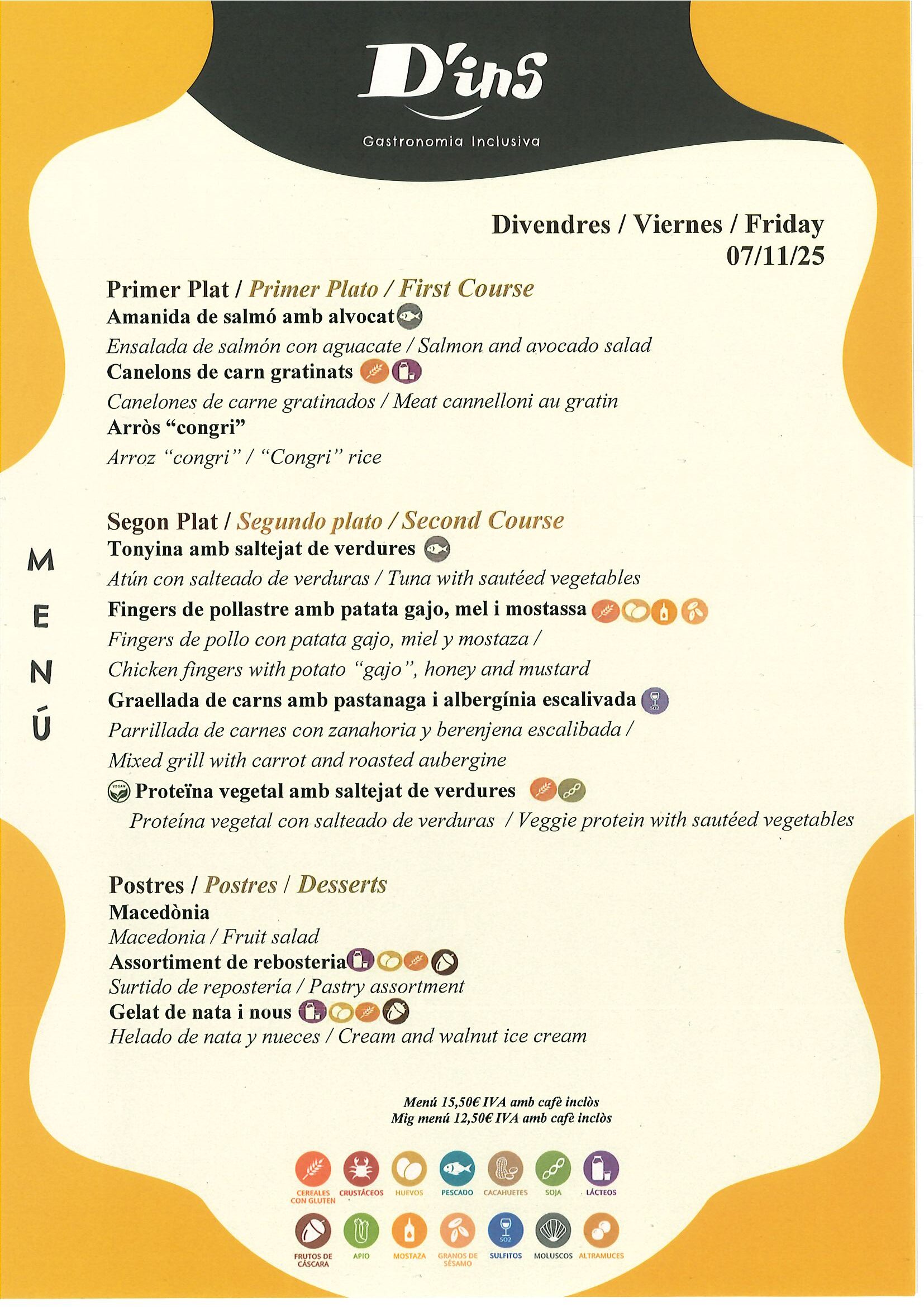 Menú Diari (que inclou primer, segon, postre i una beguda) – 15,50 € IVA inclòs