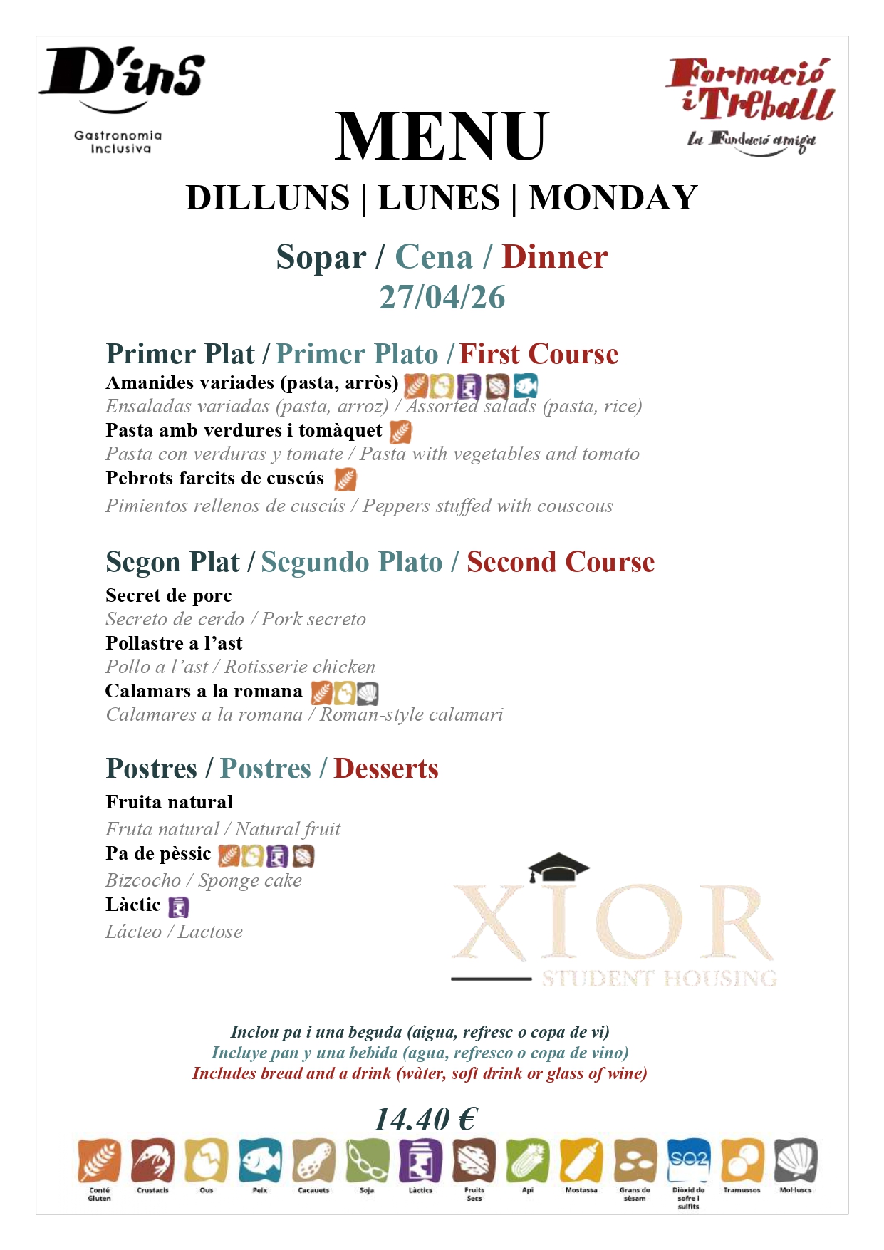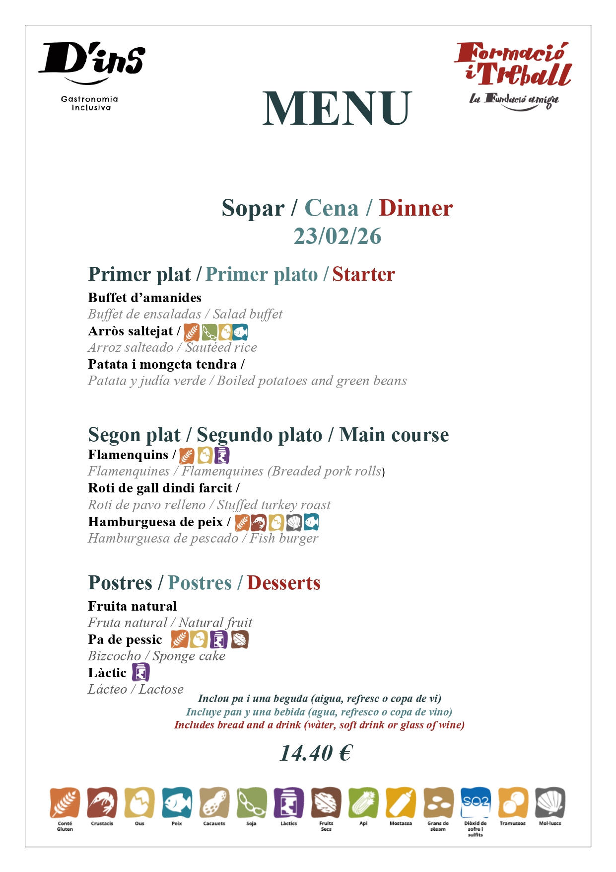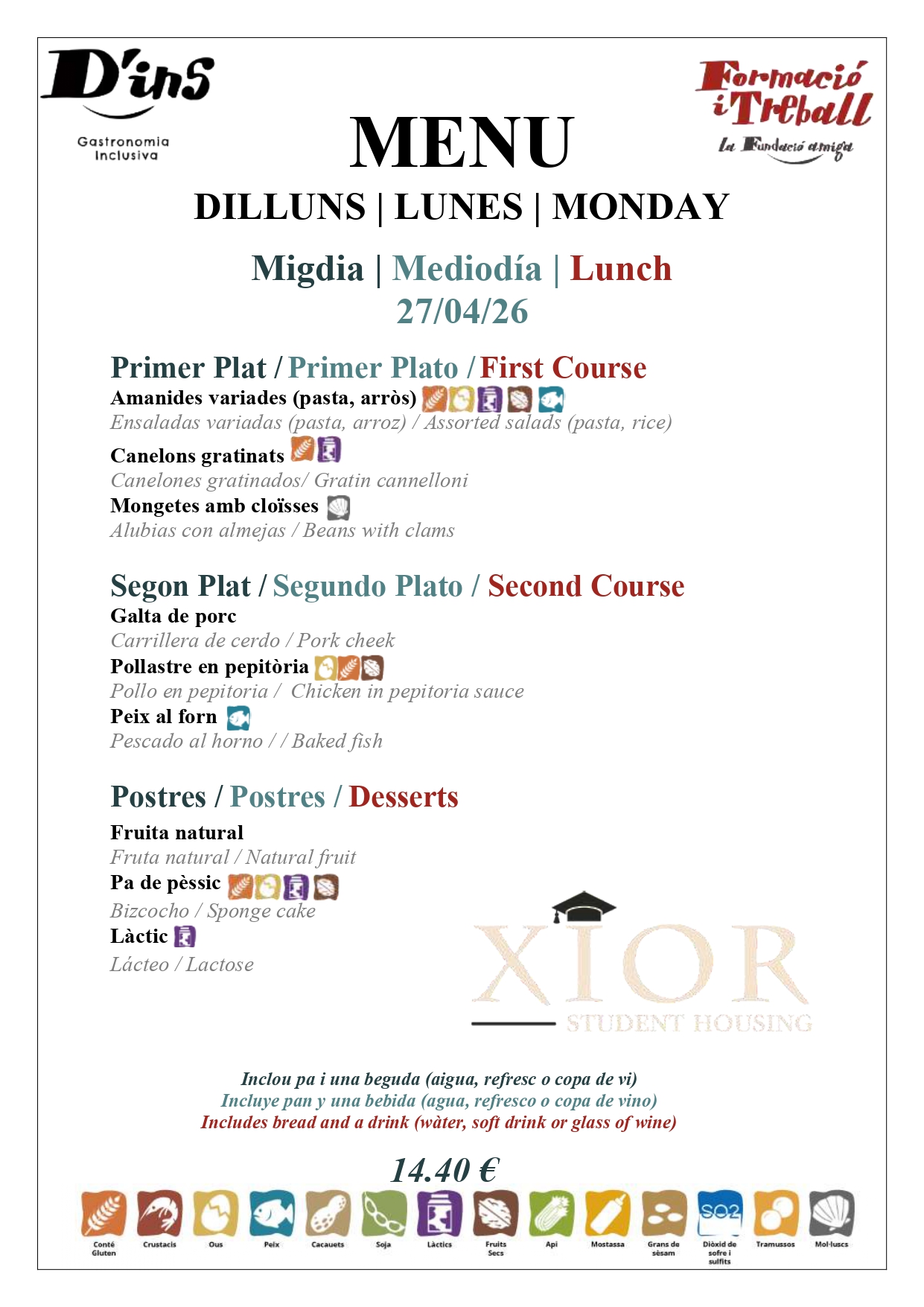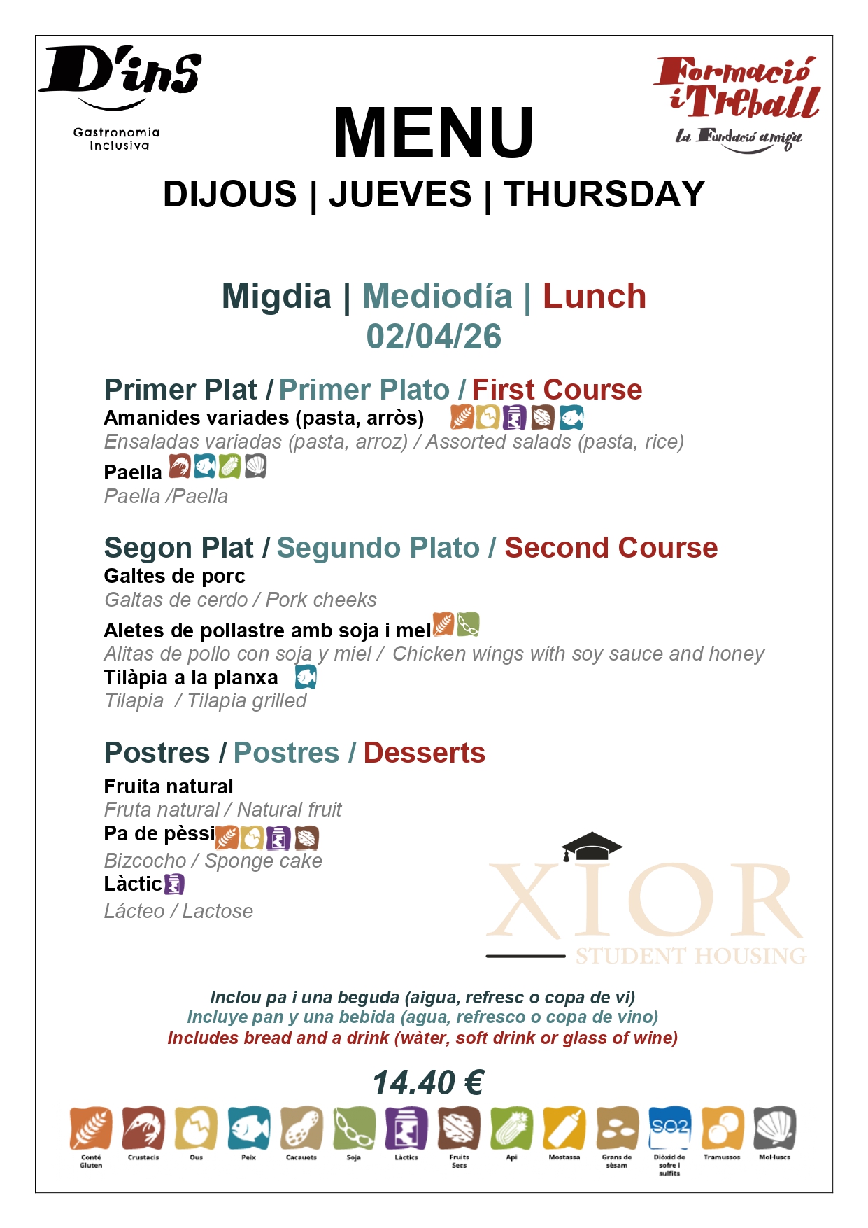 El servei de Menú és un bufet assistit pel nostre personal, on trobaràs opcions aptes per tothom. Cada dia s’elabora un menú casolà, saludable, amb productes de proximitat i treballant per evitar el malbaratament alimentari.